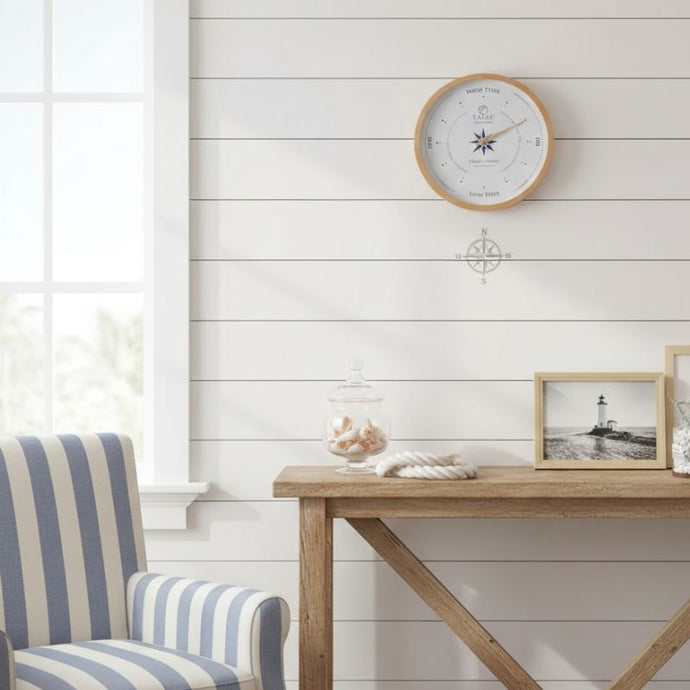 Découvrez l'Horloge Des Marées Avec Indicateur Marin au design circulaire doré et blanc, parfaite pour suivre les marées à bord de votre bateau.
