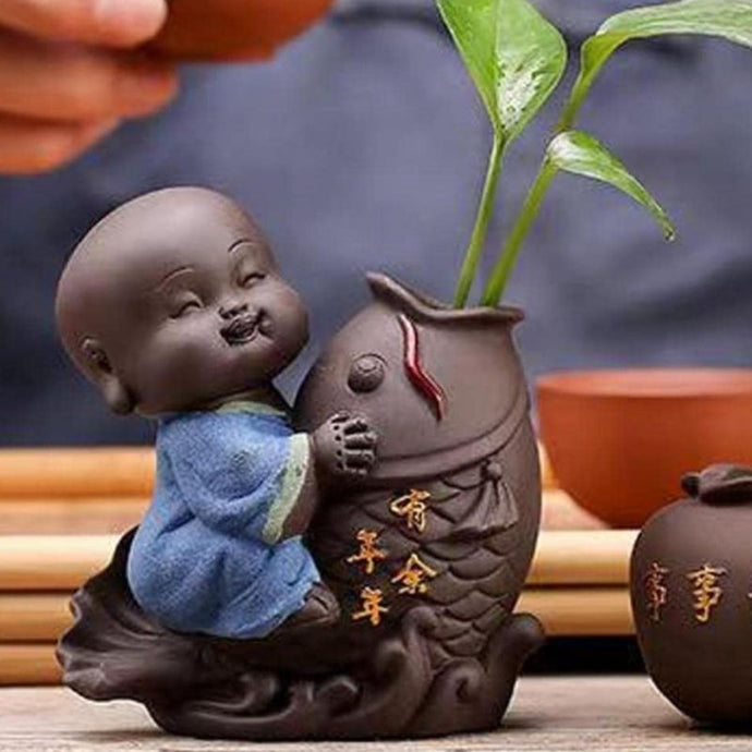 Sculpture En Argile Petit Moine Joyeux Avec Vase