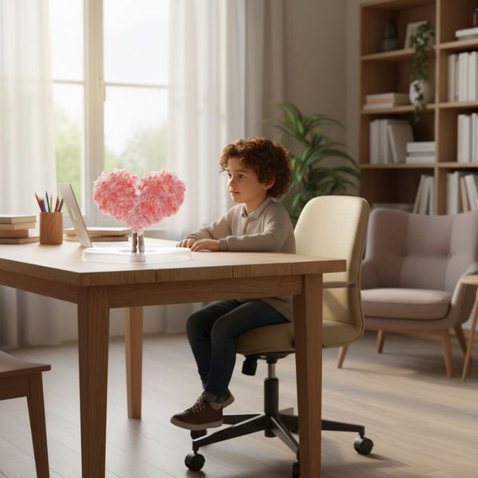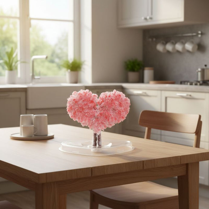 La Sculpture Papier Arbre en Cœur en art moderne combine papier et réactifs chimiques pour un effet magique miniature.