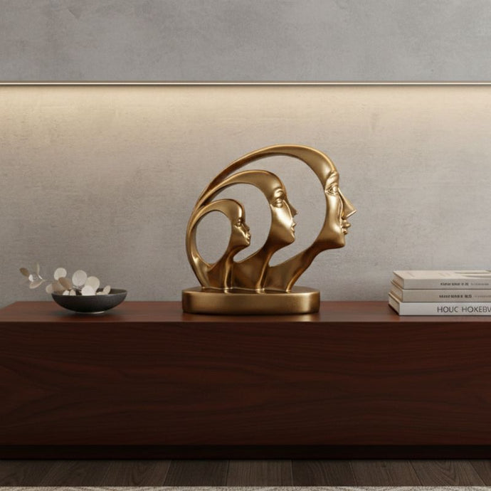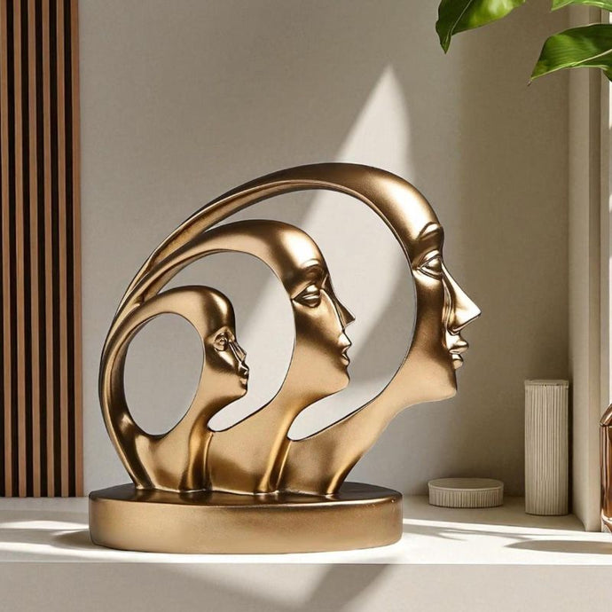 La Sculpture Visage Dorée Avec Formes Multiples En Design Abstrait combine des formes en résine raffinée pour un effet artistique et éloquent.