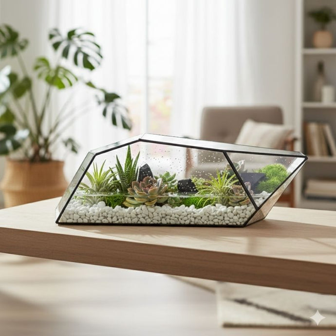 Le Terrarium En Verre Géométrique Allongé offre une élégance contemporaine à votre intérieur, mesurant 31 × 10,5 × 10 cm, parfait pour aménager vos espaces.