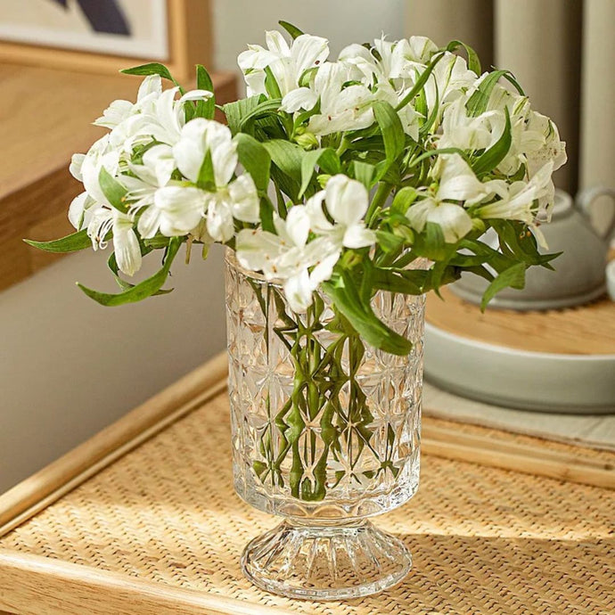 Offrez à votre espace une allure raffinée avec ce vase en cristal gaufré. Conçu pour accueillir des fleurs de haute qualité, il rehausse toute table. Son design unique et élégant en fait un atout incontournable pour votre décoration intérieure.